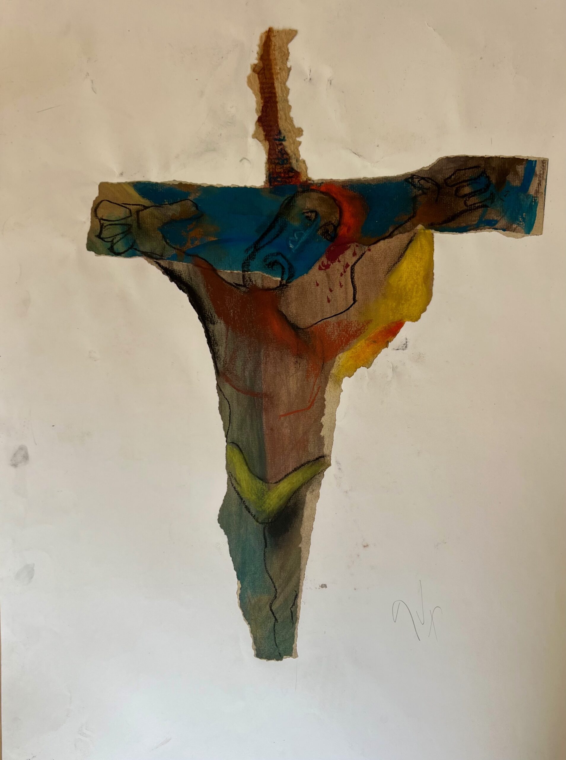 Craie d’art et collage sur papier, signé bas droite